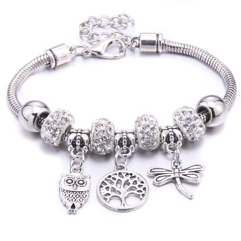 Pulseira Berloque Prata com efeito mola, ajustável ao seu pulso, combinamos os Berloques mais lindos em formato de coruja e libélula, berloque de cristal que garante um brilho ainda mais único e realça o seu look.